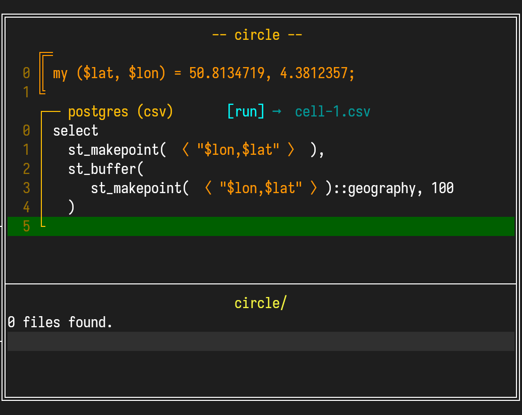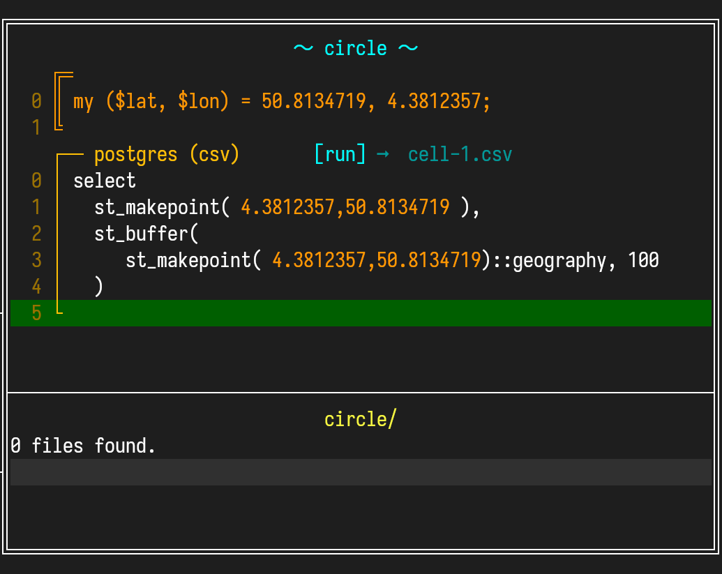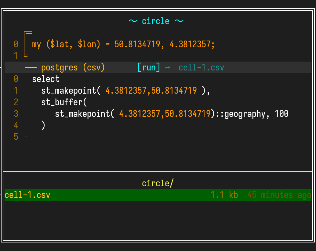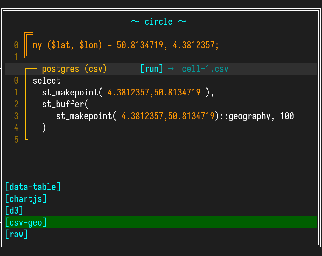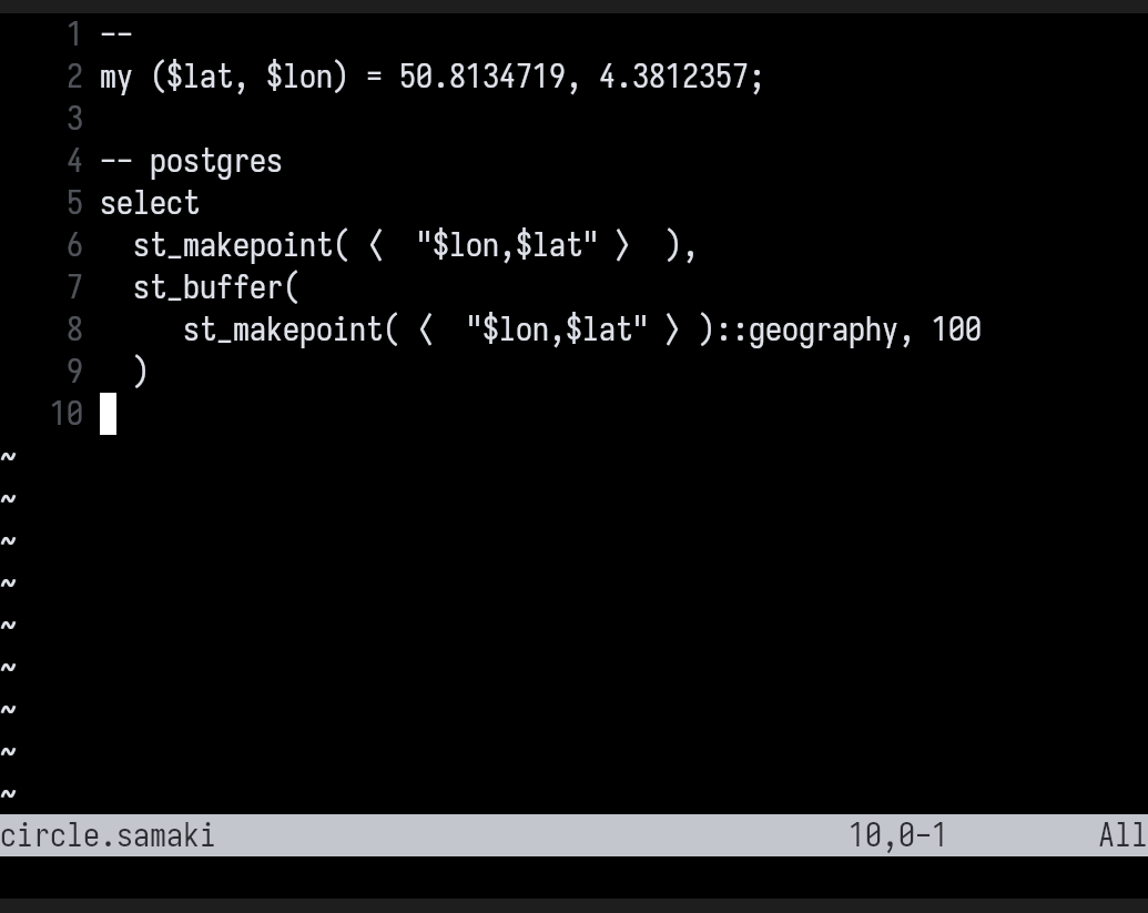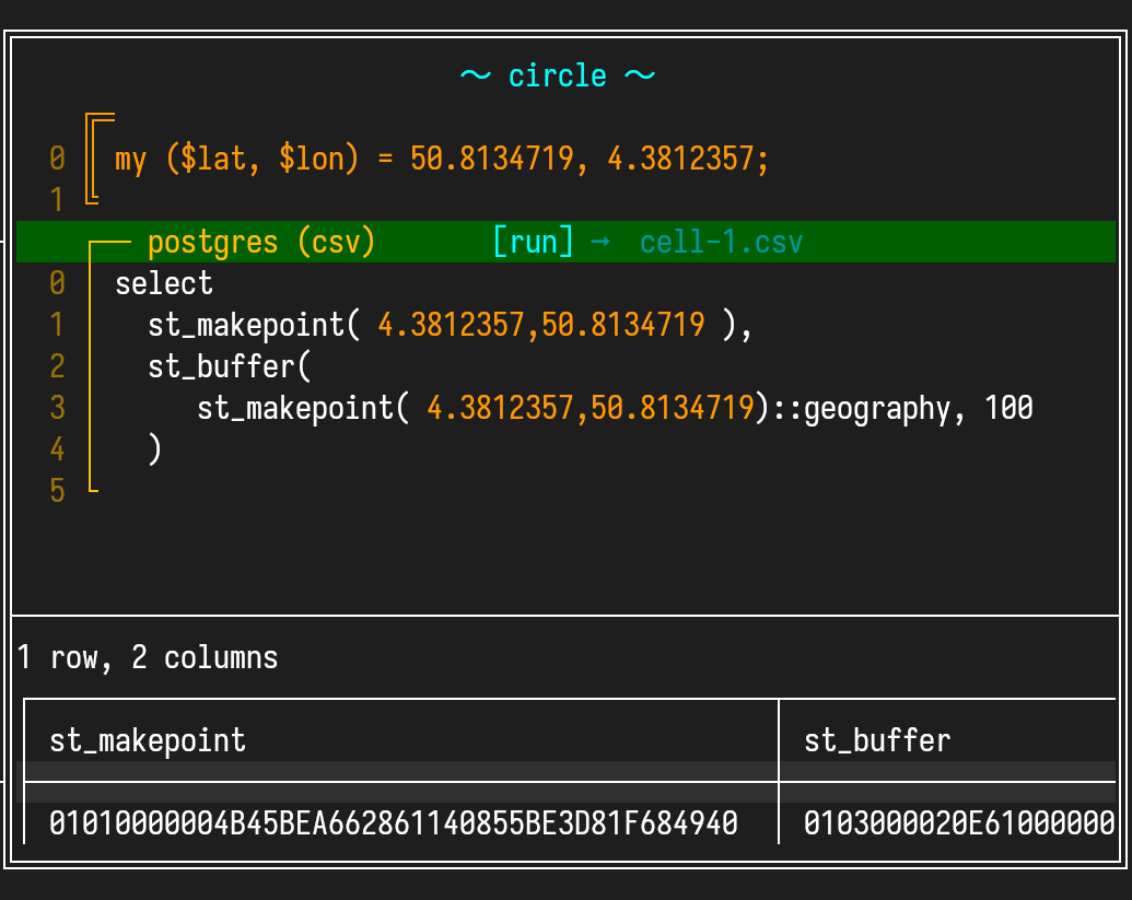 select st_buffer( st_makepoint(〈 cell("location").res<lon lat>.join(',') 〉), 1) as ring