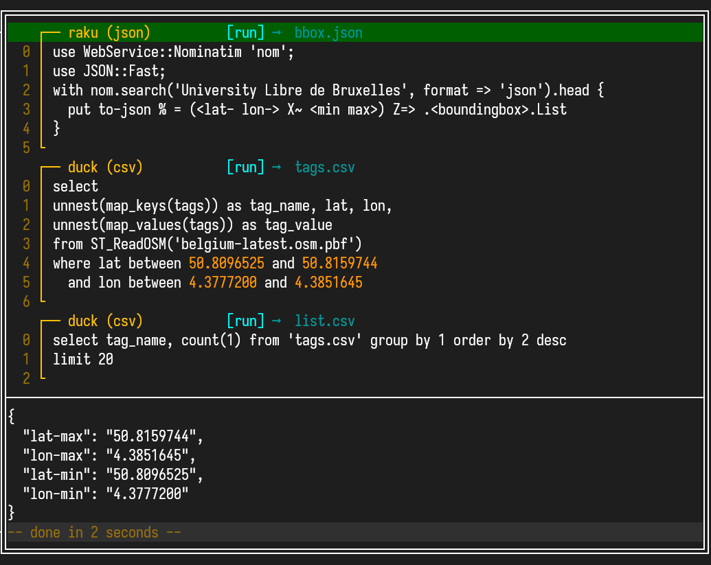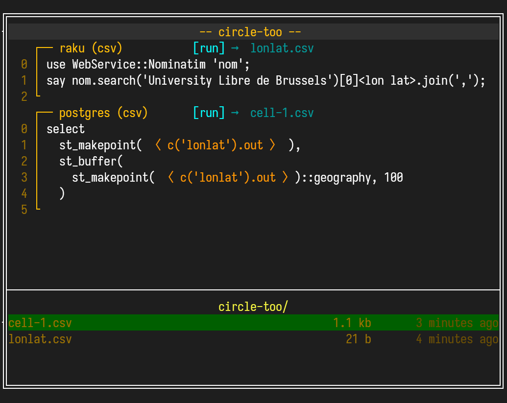 Plugin | Type | Description ========================|==========|============================================ Bash | Process | Execute contents as a bash program Code | | Evaluate raku code in the current process Duck | Process | Run SQL queries via duckdb executable Duckie | inline | Run SQL queries via L<Duckie> inline driver File | | Display file metadata and info HTML | | Generate HTML from contents LLM | inline | Send contents to LLM via LLM::DWIM Markdown | inline | Generate HTML from markdown Postgres | Process | Execute SQL via psql process Raku | Process | Run raku in a separate process Repl::Raku | Repl | Interactive raku REPL (persistent session) Repl::Python | Repl | Interactive python REPL (persistent session) Repl::R | Repl | Interactive R REPL (persistent session) Text | | Write contents to a text file