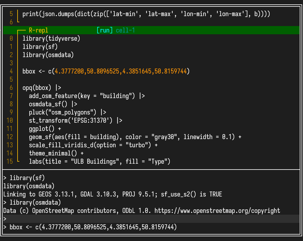 -- python import this -- duckdb select st_buffer(...) as ring -- R plot(...) -- llm What latitude is the northernmost point in Belgium?